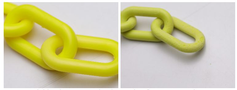 (對照:抗 UV 塑膠鍊條 vs. 一般塑膠鍊條 – 1,000 小時耐黃變測試結果)