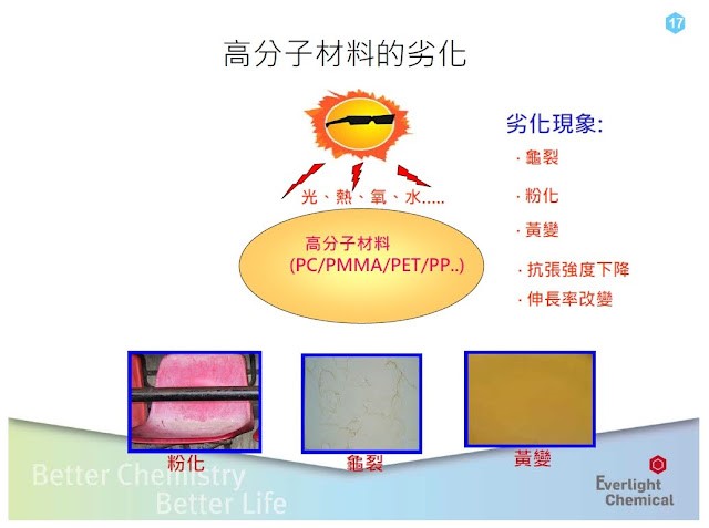 高分子材料在室外使用時,則會因光、紫外線(UV)、熱、氧氣、水、金屬離子的作用而劣化。(degradation)